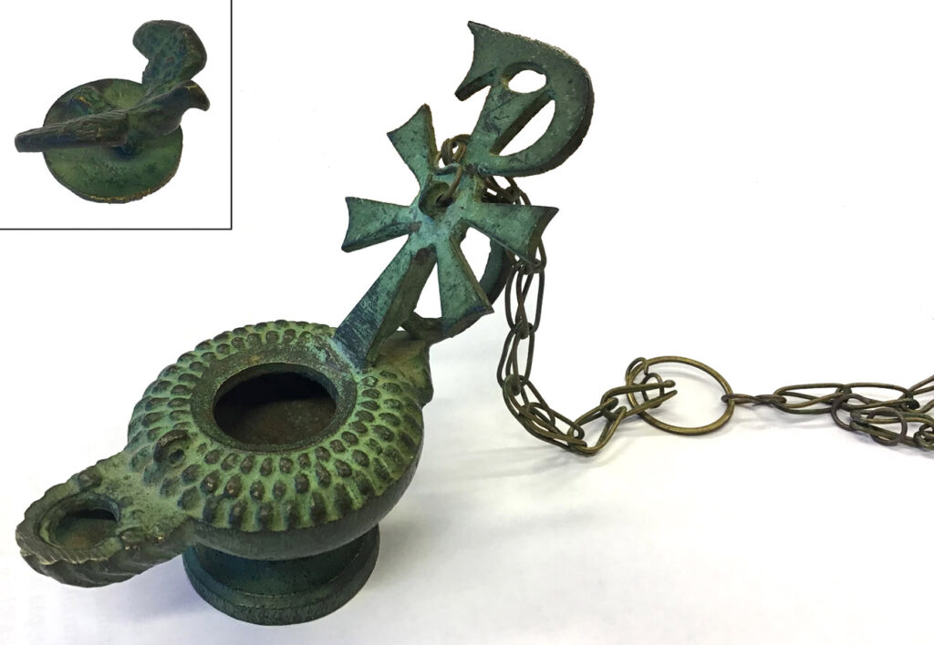 Kristogrammi eli kreikan kirjaimet Χ ja Ρ (rho) nimen Khristos alkukirjaimina ja merkittyinä päällekkäin tuli tunnetuksi kristinuskon symbolina Rooman keisari Konstantinus Suuren (hallitsi 306–337) käytettyä sitä sotalipussaan. Se yhdessä lampaan, simpukan ja kyyhkysen kanssa onkin osoituksena esikuvana olleen öljylampun kristillisestä käytöstä. Lamput olivat konkreettisia välikappaleita yön pimeyden ja tuonpuoleisen varjojen voittajina tiellä pelastukseen, muun muassa evankelista Johannes puhuu Kristuksesta maailman valona (Joh. 1:4 ja 8:12).