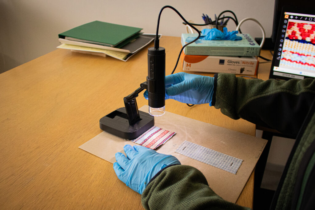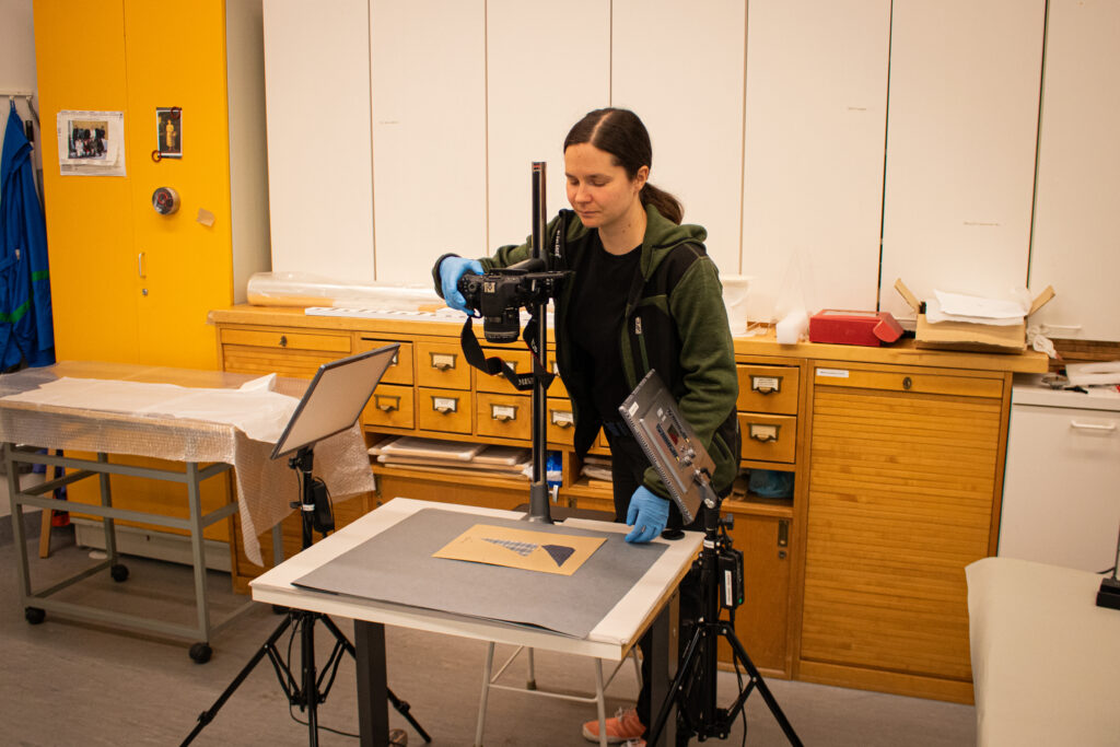 -Jag katalogiserar, det vill säga för in information om textilprovssamlingarna i det digitala samlingsförvaltningssystemet (MuseumPlus) och fotograferar dem. Dessutom gör jag Excel-filer från vilka jag får uppgifter om provhelheterna. Jag läser också mycket litteratur som ger bakgrund om provens historia, berättar Hämäläinen.