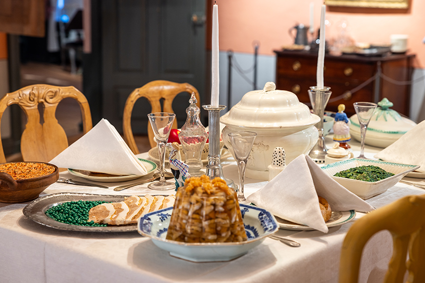 I Holmska gården fyller julstämningen hela andra våningen. I centrum för 1700-talets julfirande står det imponerande festbordet som dukats upp i salen. Skinka, lådor och rosoll är fortfarande bekanta inslag för många finländare, medan spenatstuvning och aladåb, det vill säga köttgelé, numera är ovanligare inslag vid julbordet.